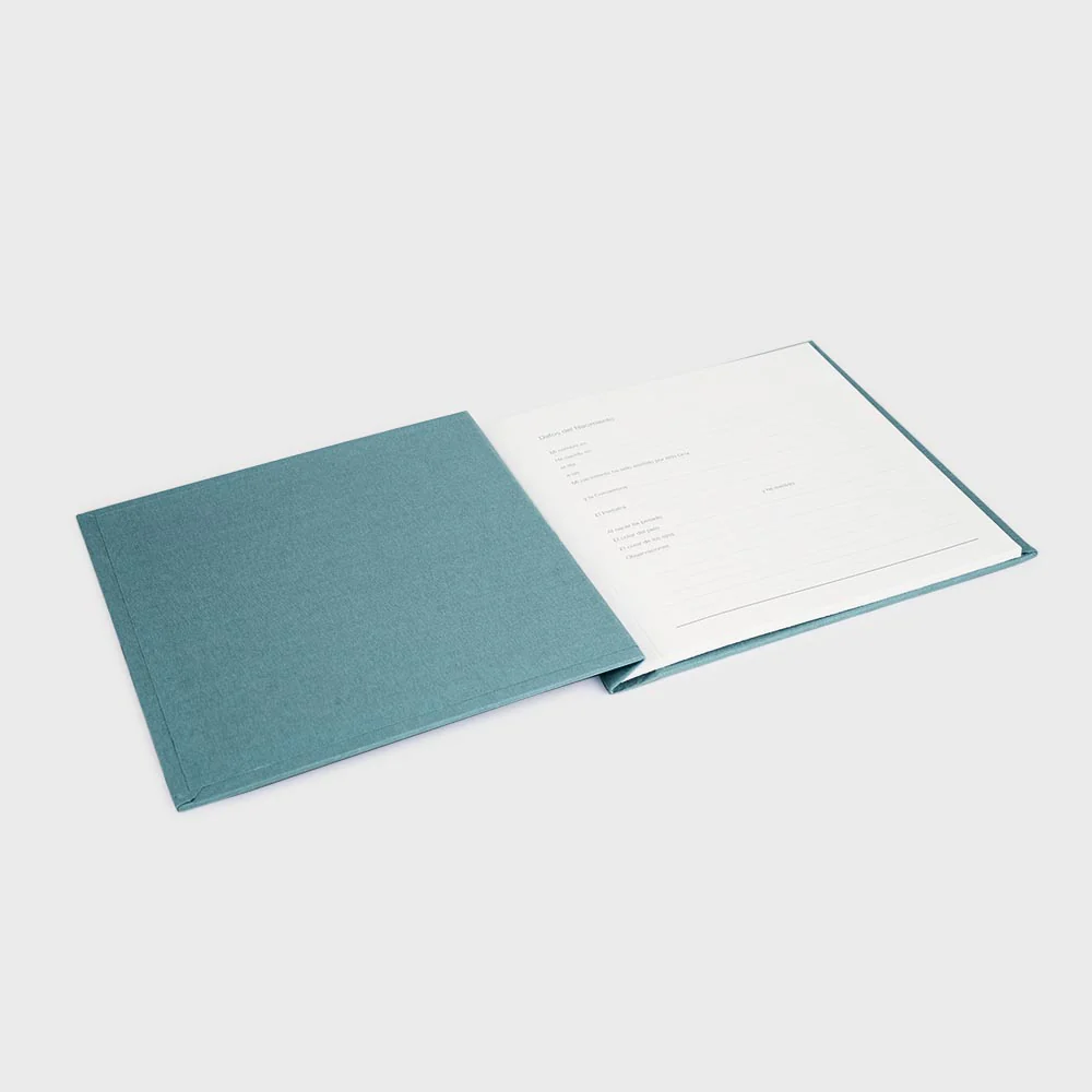 Encuadernado con un lazo y con las tapas forradas artesanalmente en tela, disponibles en 3 colores. La tapa frontal contiene un estampado en seco que deja un relieve una ilustración de un cochecito. Contiene 16 hojas de cartulina de color ivory de 250grs.